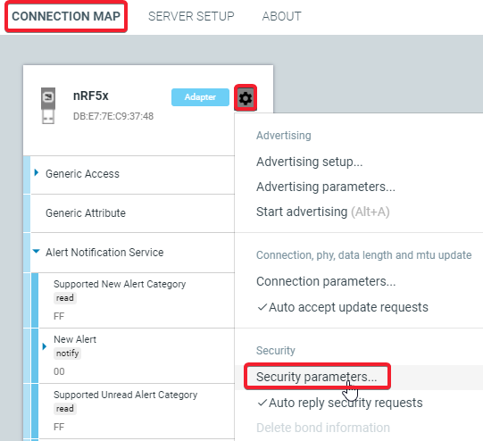 ▶ To bond, click the settings button for the server in nRF Connect, select "Security parameters",