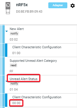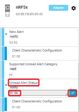5-13> Set the value of the Unread Alert characteristic (0x2A45) to '01 04' and click the 'write' button.