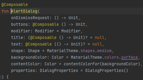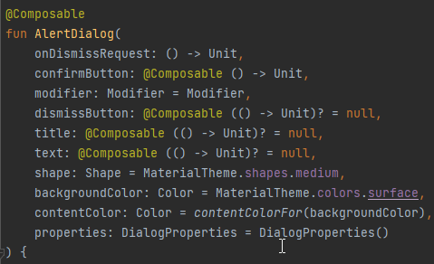 ▶ AlertDialog 오버라이드 2개의 함수중 다음을 사용하겠습니다. (AndroidAlertDialog.android.kt)