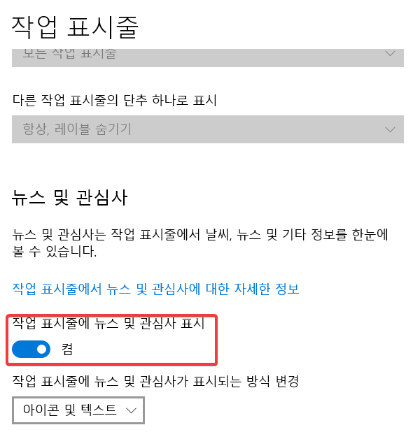 ▶ 작업표시줄 설정 > 뉴스 및 관심사 > 작업표시줄 뉴시및 관심사 표시